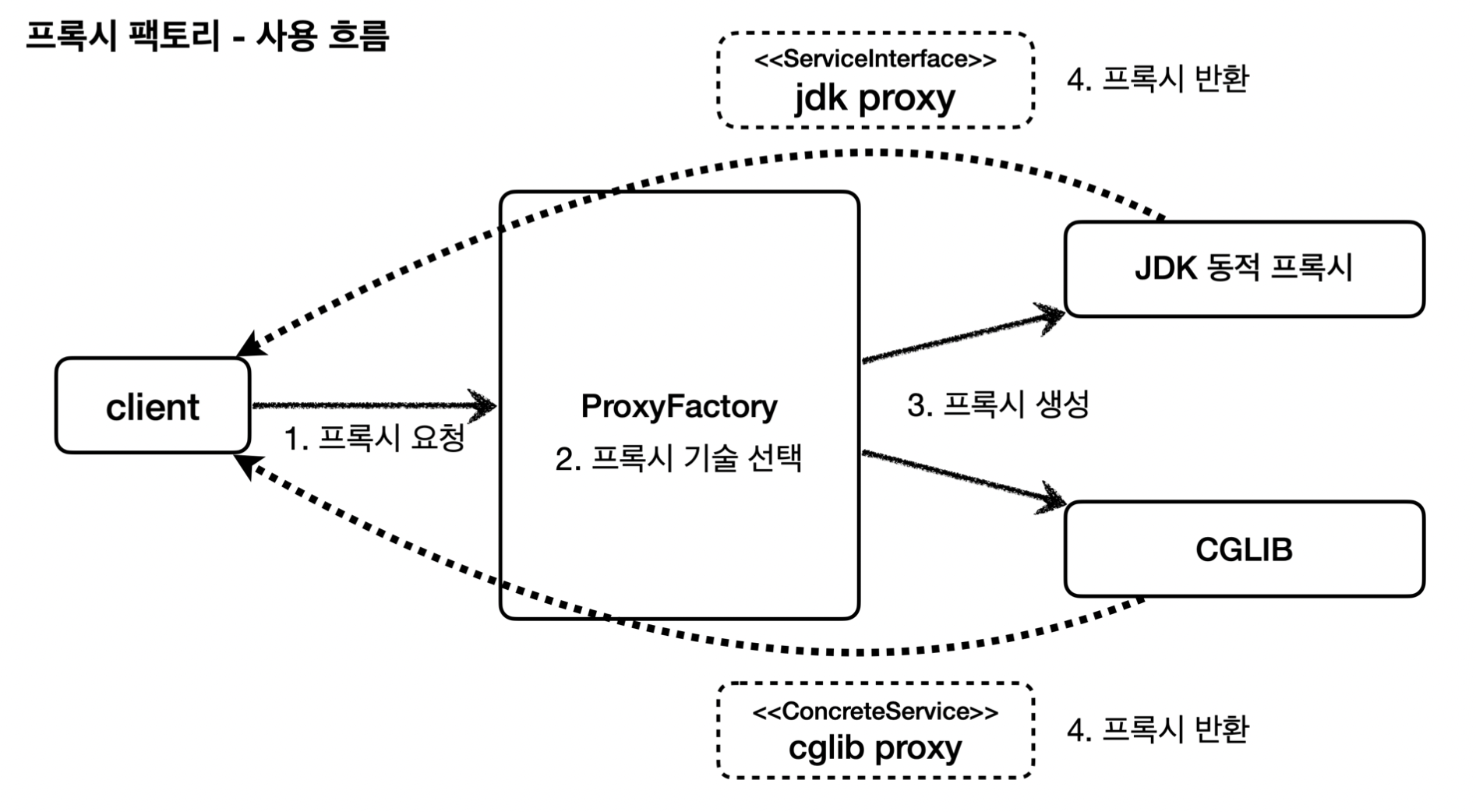 JDK Dynamic Proxy는 인터페이스를 구현(Implement)하고, CGLIB는 구체 클래스를 상속(extends)해서 프록시를 생성한다.
